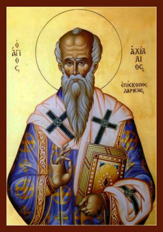 Святитель Ахиллий, епископ Ларисийский, жил в IV веке, в царствование равноапостольного Константина Великого. Прославившись святостью жизни и ученостью, он был поставлен епископом города Лариссы в Фесалии. Святитель Ахиллий был участником I-го Вселенского Собора, где смело обличал еретика Ария. В своем городе он усердно насаждал христианство, разрушая идольские капища, строил и украшал церкви. Святитель Ахиллий имел дар исцелять болезни, особенно беснование, и совершал много чудес. Скончался святитель мирно около 330 года. Мощи его с 978 года находились в Болгарии в городе Преспу (ныне село Ахили, названное так в честь почившего святителя). В 1981 году мощи святителя Ахиллия были возвращены в греческий город Ларису и покоятся в митрополичьем соборе Святого Ахиллия.