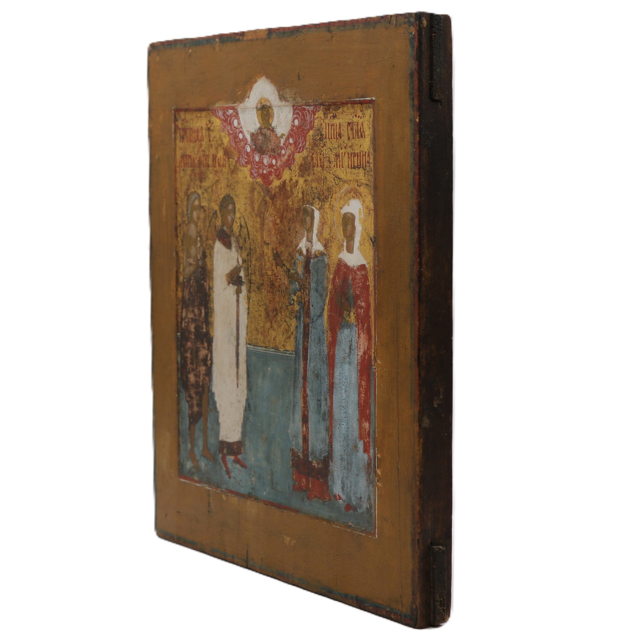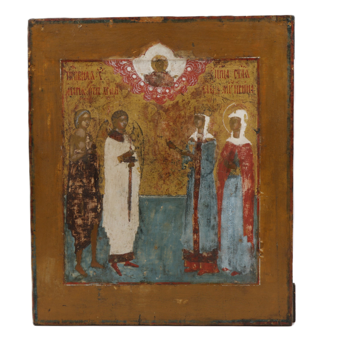 На иконе изображены: прп. Мария Египетская, Ангел Хранитель, свт. Елена, свт.Ирина