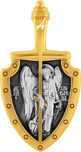 На обороте образка изображен меч, с библейским времен являвшийся символом духовной борьбы. Сам Господь говорит о Себе: «Не мир пришел Я принести, но меч» (Мф. 10: 34). Ангелы с мечами в руках предстают и в Священном Писании. «Духовным мечом» они охраняют человеческий род от сил зла. Но Ангел не может действовать против желания человека. Поэтому к нему нужно обращаться в ежедневных молитвах как к ближайшему духовному наставнику. Одна из таких молитв написана на оборотной стороне образка: «Святый Ангеле, храни мя».