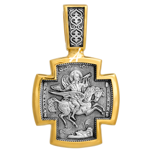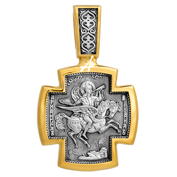 На образке, выполненном в форме равностороннего креста, Архангел Михаил изображен скачущим на крылатом коне и трубящим в рог. Это яркий образ, созданный русской иконописью, где Архангел Михаил представлен как верховный военачальник, созывающий небесное воинство на борьбу с силами зла.