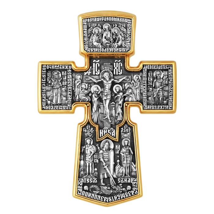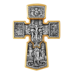 На лицевой стороне креста в центре находится Распятие Иисуса Христа с предстоящими святыми, которые не покинули Христа во время его страданий. Слева изображены образы Богоматери и двух Марий — Жен Мироносиц: Марии Магдалины и Марии Клеоповой. Справа — образ великого апостола Иоанна Богослова, приложившего к груди руку, знак скорби. За ним стоят тайные ученики Христа: праведный Иосиф Аримафейский, отдавший для погребения Спасителя приготовленный для себя гроб, и праведный Никодим, пожертвовавший для умащения Тела Христова драгоценную смирну и алоэ. Над сценой Распятия Христова — икона Святой Троицы и молитва Ей: «Пресвятая Троица, помилуй нас: Господи, очисти грехи наши; Владыко прости беззакония наши; Святый, посети и исцели немощи наши имени Твоего ради».