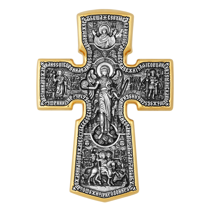 Обратную сторону креста по борту опоясывают слова «Символа веры». Это великое и священное исповедание веры, которое каждый христианин должен знать наизусть. В центре креста изображена фигура самого сильного из ангелов, предводителя ангельского воинства, Архангела Михаила. Над его главой — высший ангел, огненный серафим. И выше всех ангелов, и архангелов, «Честнейшая Херувим и славнейшая Серафим», стоит Пресвятая Богородица. На кресте Она изображена в Ее иконе «Нерушимая Стена». Матерь Божия подняла руки в молитве и как щит ограждает православных, помогает победить в тяжкой схватке с дьявольскими силами.