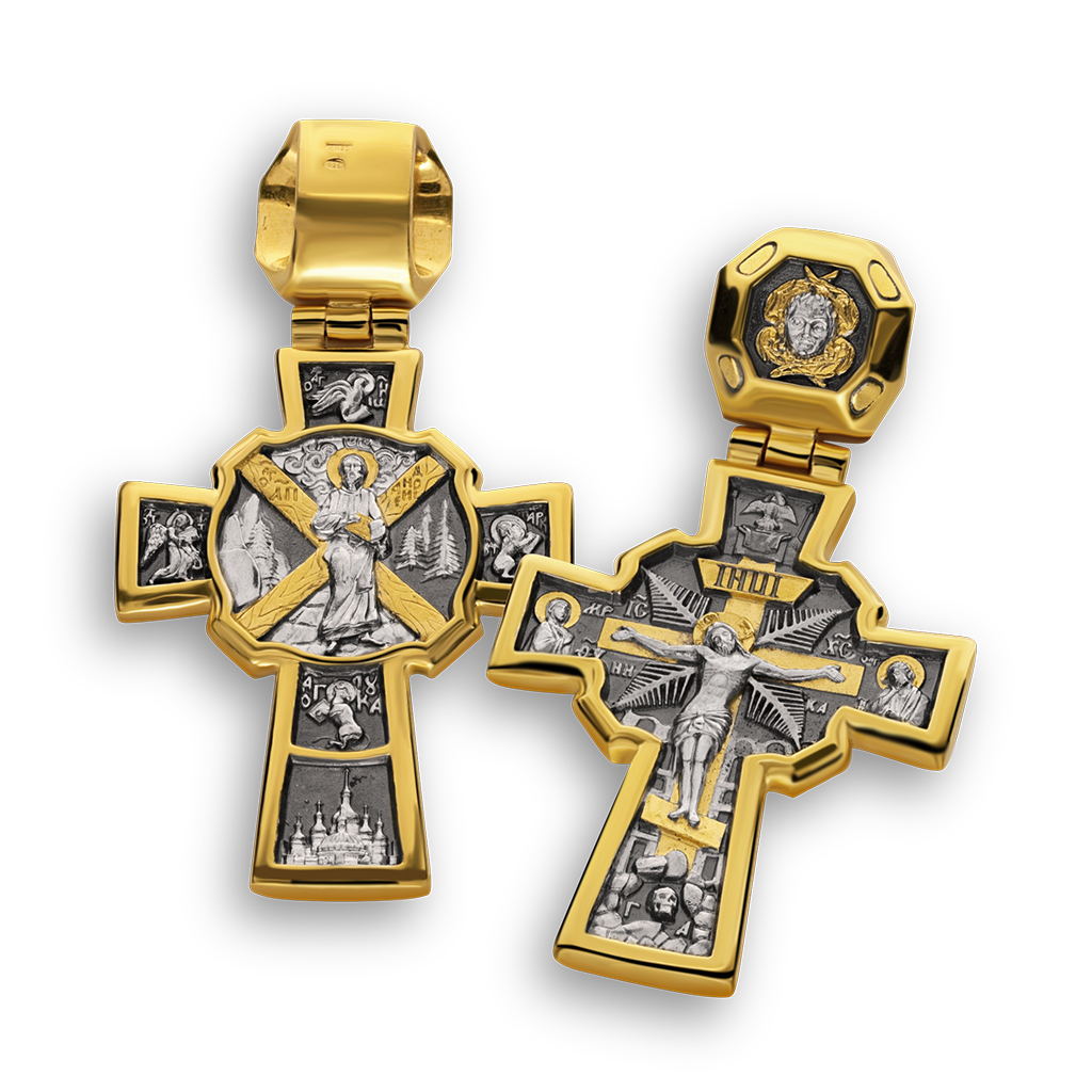 На лицевой стороне изображено распятие Спасителя, справа от Него Пречистая Дева, слева любимый ученик Иоанн Богослов. В подножии распятия прах первого человека Адама, по преданию он находился на Голгофе. На заднем плане Иерусалим и пальмовые ветви, которыми встречали Господа, когда он въезжал в город на ослице.