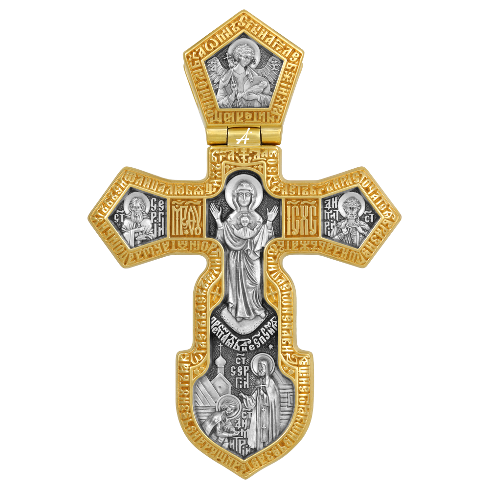 По традиции, оборотная сторона креста посвящена Богоматери. Здесь Она представлена в древней иконографии «Оранта», в полный рост, с воздетыми в молении за всех людей руками. На Ее груди — Иисус Христос в образе Младенца, у ног — молитва «Пресвятая Богородица, спаси мя». Вверху, на ухе креста, изображен Ангел Хранитель, бережно несущий человеческую душу, а вокруг образа — молитва: «Святый Ангеле Божий, Хранителю мой, моли Бога о мне».