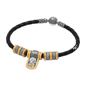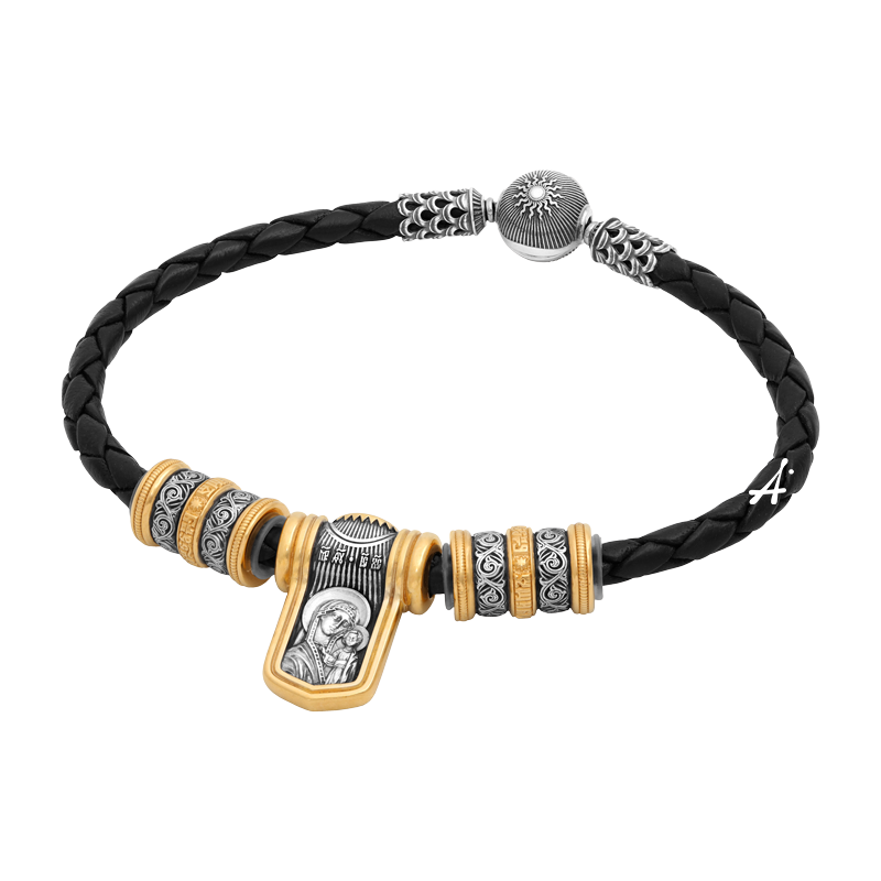 Основой браслета является плетеный шнур из натуральной кожи с фирменной застежкой-клипсой из серебра. На центральной бусине, выполненный в виде хоругви, помещена икона Божией Матери «Казанская». Это самый почитаемый чудотворный образ в России. С Казанской иконы сделано множество списков, которые сами прославились чудесами во многих городах страны. Один из наиболее известных и чтимых — список с великой иконы в Казанском соборе Санкт-Петербурга. Перед этим образом молится фельмаршал Кутузов, отправляясь в 1812 году на войну с Наполеоном.