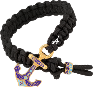 Охранный браслет из плетеного паракорда удерживается на руке с помощью застежки в виде якоря. Якорь вручную расписан орнаментом из горячей эмали. На штоке якоря на латыни написано слово «spes», что переводе означает «надежда».