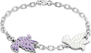 Нежный, тонкий, изящный браслет из серебра с христианским символом «Голубь и голубка» расписан вручную горячей эмалью. Голубь и Голубка, помещенные на одном браслете — это символ влюбленных, нежных супругов, которые следуют рядом по жизни, храня любовь и верность.