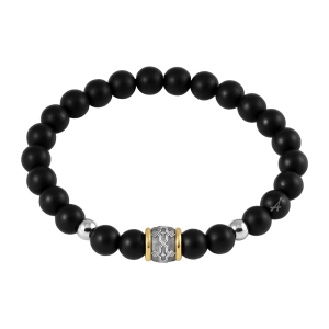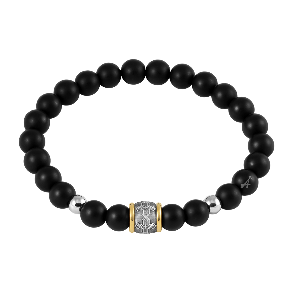 Браслет выполнен в древнерусском стиле и сочетает в себе бусину из серебра и черные бусины из шунгита. Серебряная бусина украшена традиционным русским орнаментом, в котором повторяется мотив ромба. Ромб — это древний символ плодородия и земли. На бусинах в ромбах заключены небольшие крестики, поэтому в такой интерпретации ромб — это образ земли, которую Иисус Христос спас Своим Крестом для вечной жизни.
