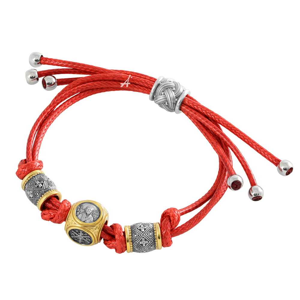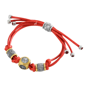 На браслет также надеты серебряные бусины с христианскими символами. Это две бусины с образом Процветшего Креста — древнейшего и очень почитаемого символа Креста Господня, Древа Жизни, процветающего виноградной лозой. Она символизирует вечную жизнь, дарованную Господом. Еще одна бусина украшена русским традиционным плетеным орнаментом, символизирующим единство и взаимосвязь мира горнего и дольнего.