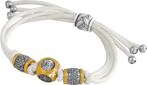 На браслет также помещены серебряные бусины с христианскими символами. Это две бусины с образом Процветшего Креста — древнейшего и очень почитаемого символа Креста Господня, Древа Жизни, процветающего виноградной лозой. Это символ вечной жизни, дарованной Господом. Еще одна бусина украшена русским традиционным плетеным орнаментом, символизирующим единство и взаимосвязь мира горнего и дольнего.