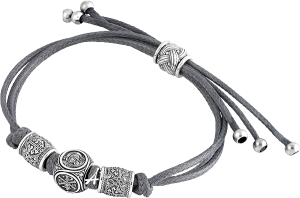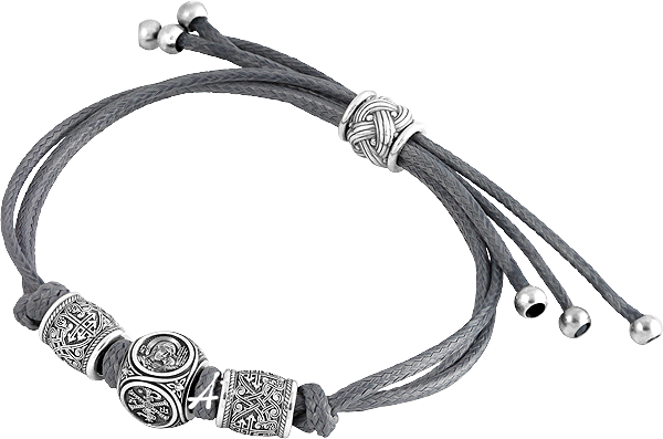 На браслет также помещены серебряные бусины с христианскими символами. Это две бусины с образом Процветшего Креста — древнейшего и очень почитаемого символа Креста Господня, Древа Жизни, процветающего виноградной лозой. Это символ вечной жизни, дарованной Господом. Еще одна бусина украшена русским традиционным плетеным орнаментом, символизирующим единство и взаимосвязь мира горнего и дольнего.