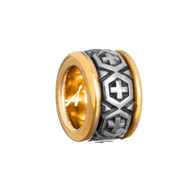 Небольшая тоненькая бусина-разделитель украшена орнаментом в традиционном византийском стиле. Такой орнамент именуется «византийской связкой». Его использовали в Византии и странах Ближнего Востока в VII–XVII веках: для драпировки шитых и расписных шелковых тканей, в росписи зданий. Основным модулем в «византийской связке» является какая-либо геометрическая фигура, в которую вписан декоративный элемент — в данном случае это симметричные ромбы с равносторонними крестиками, которые в славянской орнаментике символизируют землю, вспаханное поле. В христианском понимании — это поле души человеческой, оживотворенное молитвой и Божьей благодатью.