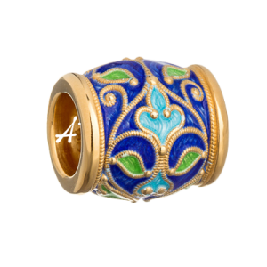 Рисунком своего традиционного орнамента эта бусина отсылает нас к царственным парчовым и шелковым нарядам. Парча, или алтабас представляет собой плотную шёлковую ткань с орнаментом из золотой волоченой или серебряной волоченой нити. Традиция носить наряды из шелковых вышитых тканей высокопоставленными особами и священнослужителями пришла к нам из Византии: с Востока же и привозили драгоценную ткань на Русь вплоть до XVII века. Позже указом Петра I ношение традиционных царских нарядов было запрещено, и потому подобные облачения сохранились только у духовенства — вплоть до наших дней. Церковные одеяния обычно расшиваются орнаментальными изображениями крестов, растений, а также иконами.