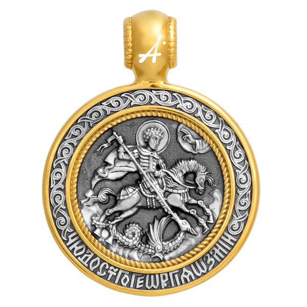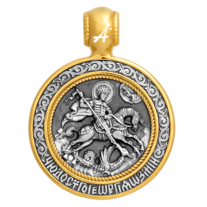 Нательный образок точно передает иконографию Чуда Георгия о змие. Икона святого Георгия, побивающего змея, выполнена как миниатюрный рельеф. Мелкая пластика, серебро, почернённое и оттененное золотом, создают ясно читаемый скульптурный образ. Скачущий всадник помещен внутрь кольца, по которому бежит волнообразный