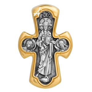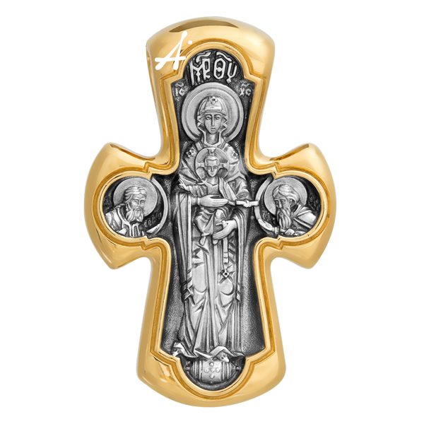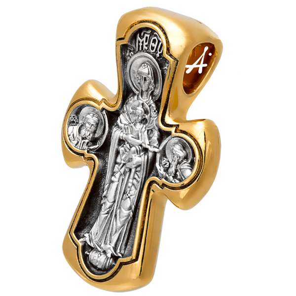 Этому страшному и великому жертвенному примеру следовали многие святые, ставшие помощниками и наставниками людей в исполнении заповеди любви. Двое из них, преподобный Серафим Саровский (слева) и преподобный Сергий Радонежский, предстоят в молении Богородице на данном кресте.