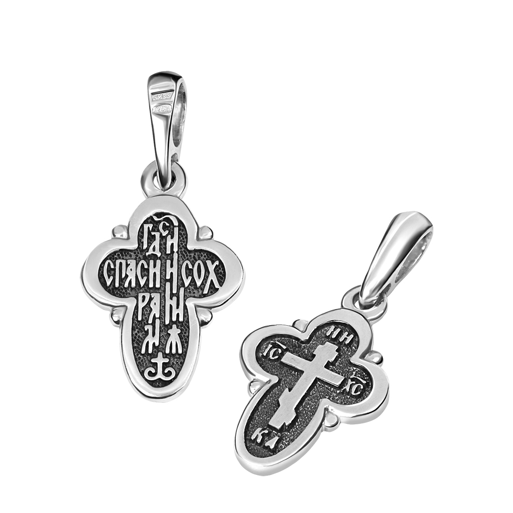 Четырехконечный детский крест с изображением восьмиконечного Голгофского креста, над крестом надпись Царь Славы. Крест имеет закругленные концы, что делает его прекрасным подарком ребенку на крещение. На оборотной стороне- молитва Прошение ко Господу. Размер: высота 2,9 см, ширина 1,4 см. Состав: Серебро 925