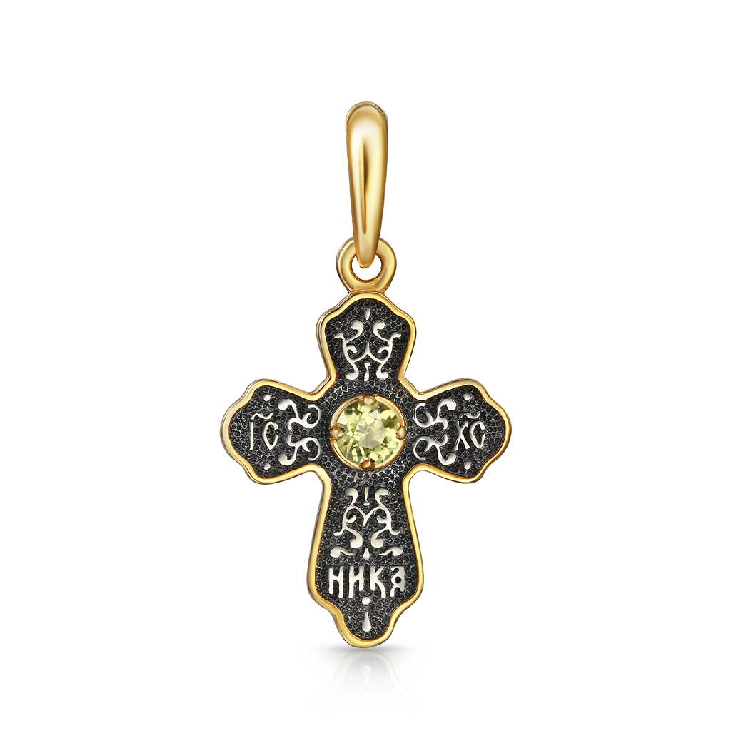 Небольшой изящный крест из серебра. Выполнен в традиционной русской форме. На лицевой стороне присутствует вставка из хризолита. На оборотной стороне изображена Казанская икона Божией Матери. Соответствует канонам и изготовлено по благословению.<br />