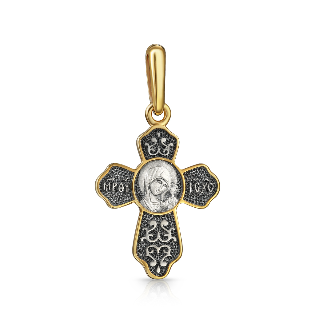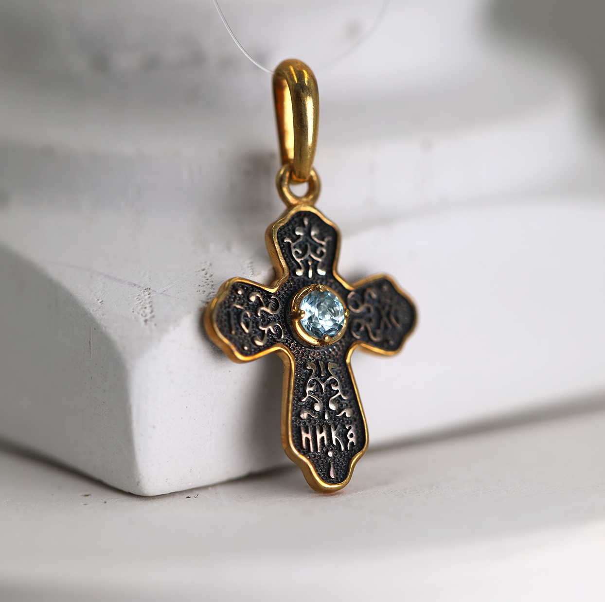 Небольшой изящный крест из серебра. Выполнен в традиционной русской форме. На лицевой стороне присутствует вставка из топаза. На оборотной стороне изображена Казанская икона Божией Матери. Соответствует канонам и изготовлено по благословению.<br />