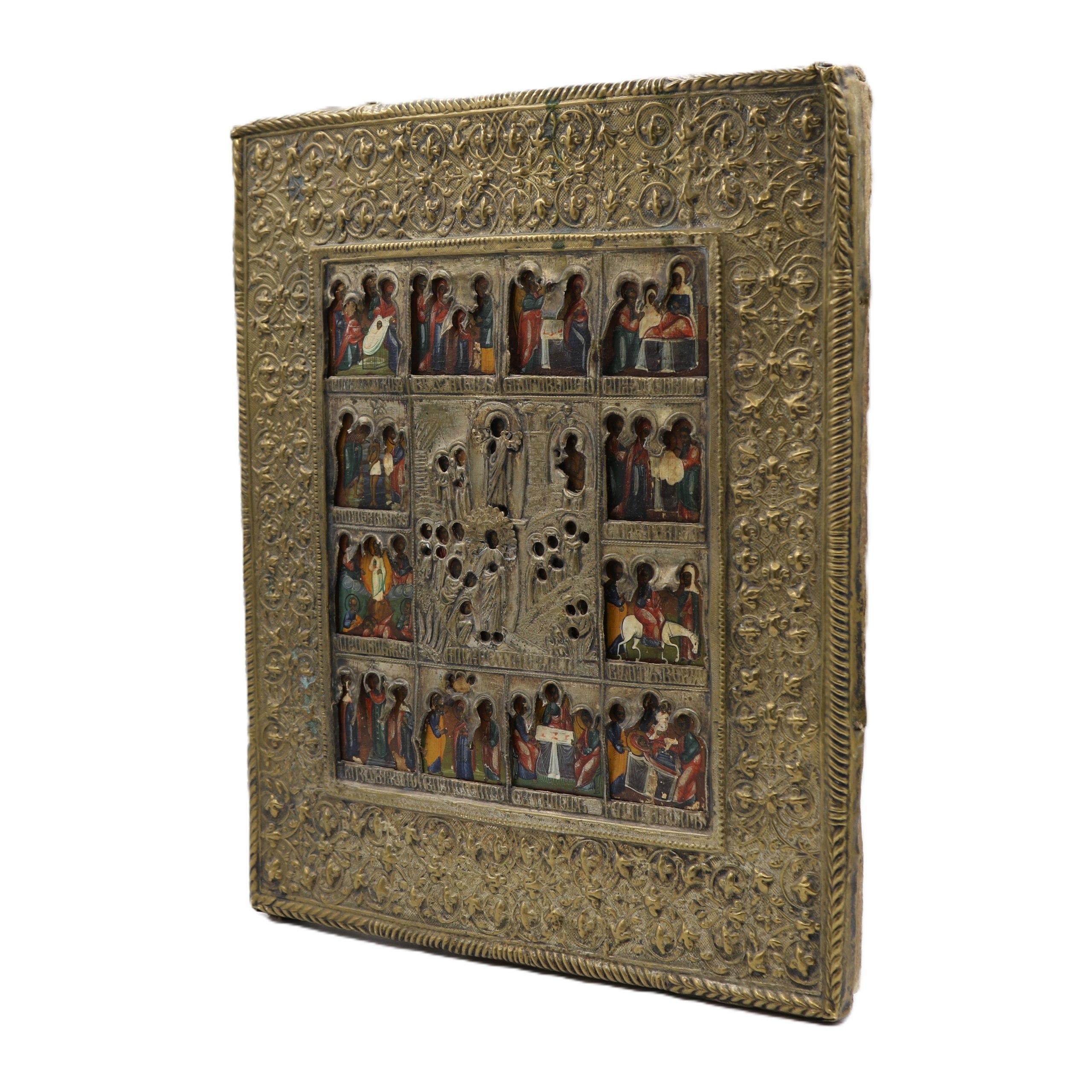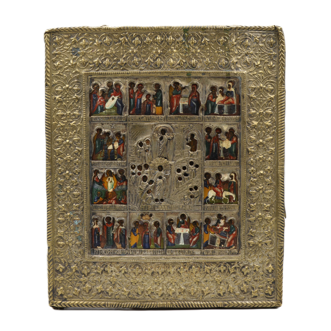 19 век. Размер иконы 27*31 см. Липа, левкас, темпера. Оклад латунь