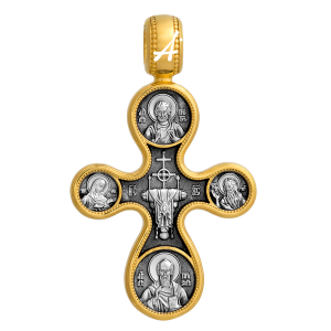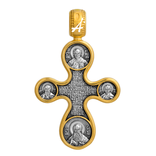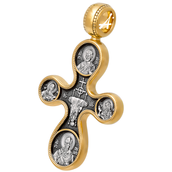 Нательный крест с закругленными концами перекладин, на которых в кругах помещены иконы восьми святых, традиционен для Русской Православной Церкви. В XV-XVI веках такая форма была одной из наиболее распространенных. В центре вместо Распятия нередко помещалась этимасия - символическое изображение Христа Вседержителя, восседающего на Престоле Уготованном.