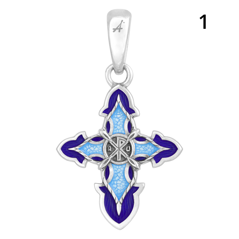 Хризма изображена на обороте креста по центру. Хризма — это монограмма имени Христа. Рядом с пересекающимися буквами Х и Р написаны первая и последняя буквы греческого алфавита — альфа и омега. Господь сказал о Себе апостолам, что Он есть «альфа и омега, начала и конец», дав тем самым понять им, что Он Творец всего сущего и Он же придет на землю при Конце Света.