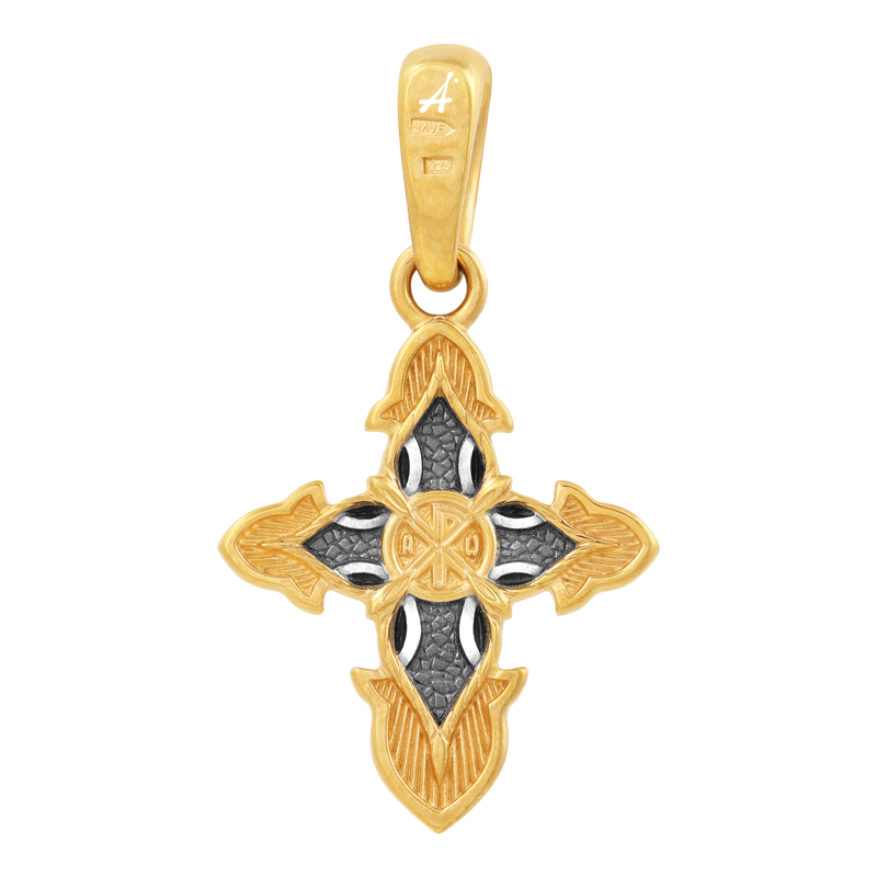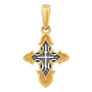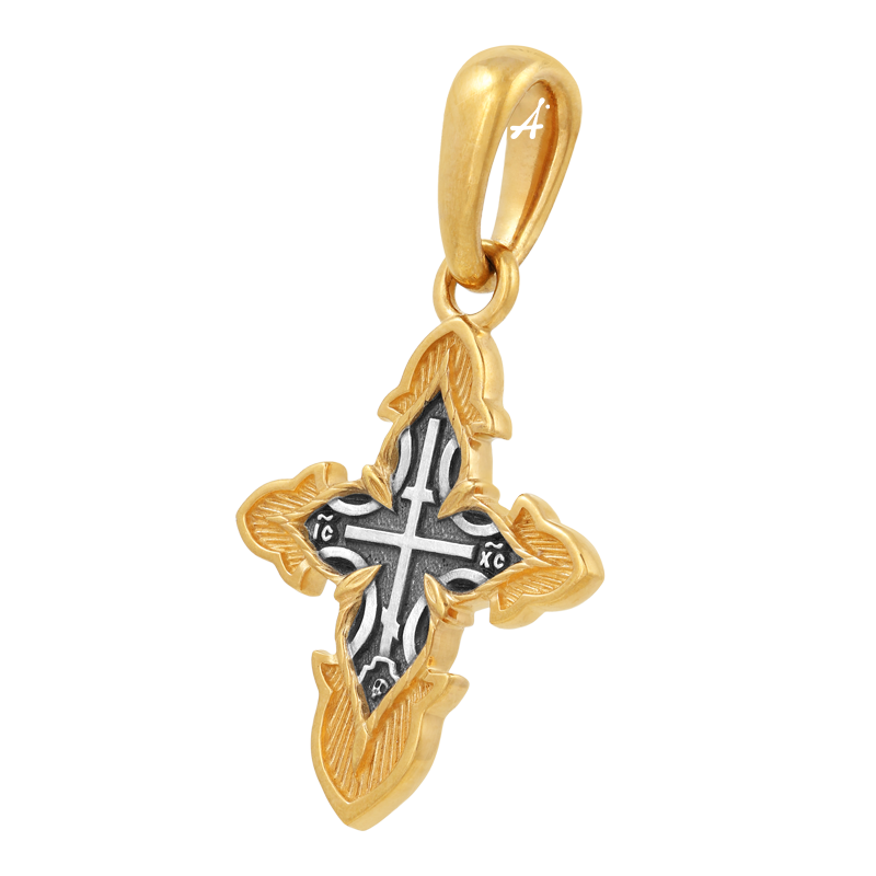 В Православной Церкви всегда существовали нательные кресты как с изображением Господа, так и без него. Сам крест, как орудие нашего Спасения, с апостольских времен почитается главным священным символом христианства. В Православной Церкви наиболее почитаемым является восьмиконечный крест, который изображен здесь на лицевой стороне. Крест установлен на схематично изображенное возвышение, которое символизирует гору Голгофу – место казни Христа. В основании Крестарасположен череп. По христианскому преданию, Господь был распят на месте могилы Адама. Кровь с Креста стекала на череп первого человека, словно омывая его от греха.