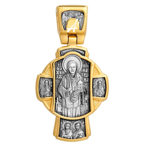 На обороте креста в центре изображена св. блж. Матрона (1885 г. – 2 мая 1952 года). Слепая от рождения, она с детских лет была наделена даром духовного зрения. Блаженная Матронушка умела видеть человеческие сердца и мысли, а также пророчески заглядывать в будущее. Господь даровал ей силу утешения в скорбях и исцеления болезней, и всю свою долгую, полную лишений и невзгод жизнь она безвозмездно помогала людям, никому не отказывая в помощи. Даже лежа на смертном одре, матушка наказывала: «Все, все приходите ко мне и рассказывайте, как живой, о своих скорбях, я буду вас видеть, и слышать, и помогать вам».