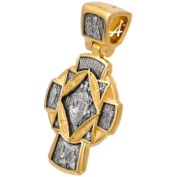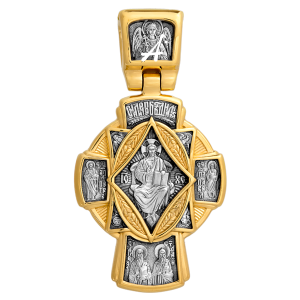 На лицевой стороне креста в центре изображена большая икона Иисуса Христа на престоле в окружении серафимов, херувимов, и символов четырех евангелистов. Такая иконография называется «Спас в силах». Обычно она помещается в центре иконостаса. Ромб, в котором находится фигура Христа, – символ Небесного Иерусалима, а четырехугольник с евангелистами по углам – символ земли. Смысл изображения – соединение Неба и земли во Христе Иисусе, которое должно произойти в конце времен. Над образом Христа на кресте помещены слова: «Иисусе – сила непобедимая».