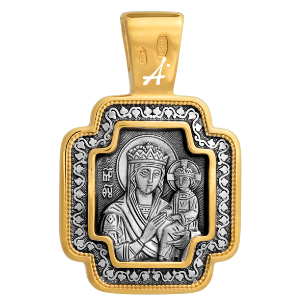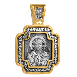 На лицевой стороне небольшого равностороннего креста изображен Иисус Христос в образе Господа Вседержителя. Оборотную сторону украшает икона Пресвятой Богородицы «Споручница грешных». Кресты такой правильной «квадратной» формы на Руси назывались греческими и особенно были распространены в XI-XII веках. Тогда они обычно вырезались из камня или дерева и носились на гайтане (веревке).