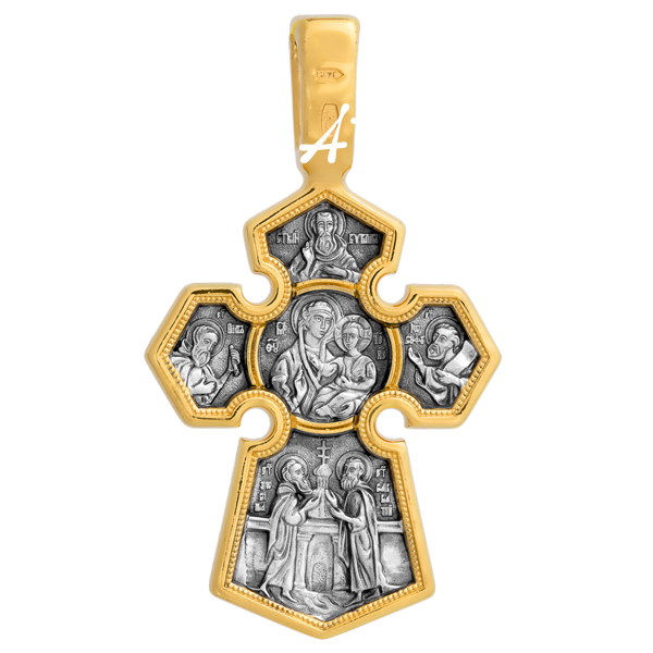В центре оборотной стороны креста помещена Седмиезерная икона Божией Матери (празднуется 26 июня (9 июля) и 13 (26) октября). Эта икона прославилась великими чудесами в Богородицкой Седмиезерной пустыни близ города Казани в ХVII веке. На крестные ходы с этой иконой приезжали со всей России, и сохранились свидетельства о массовых исцелениях больных от иконы во время этих шествий. В XVI веке чудотворную святыню принес в Казань инок Евфимий, но впервые образ с такой иконографией был написан в 1503 году великим иконописцем Дионисием для Ферапонтова монастыря, основанного в 1398 году прп. Ферапонтом Можайским (+1426).