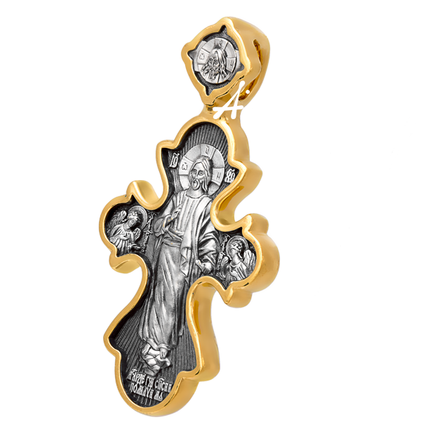 Иисус Христос на кресте изображен словно идущим навстречу людям. С двух сторон перед Ним склоняются архангелы Михаил и Гавриил, внизу начертаны слова молитвы: «Милосердне Господи, спаси и сохрани мя».