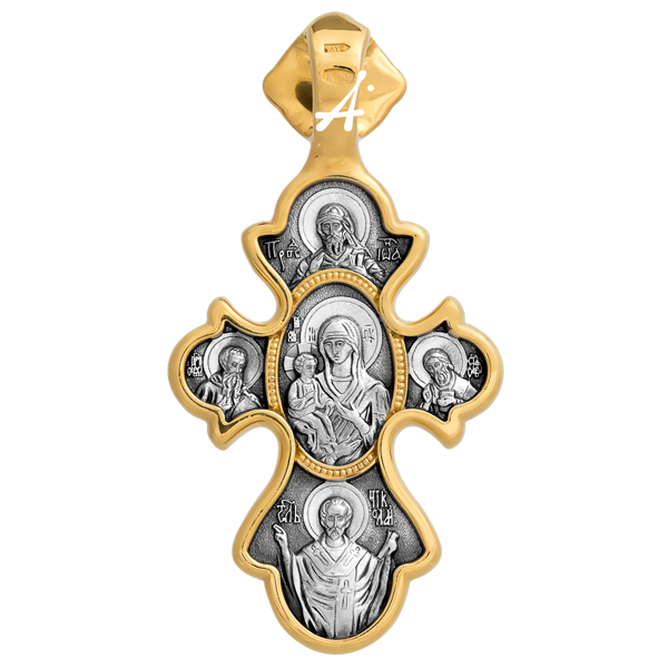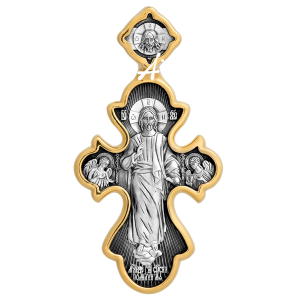 Центральным образом креста, выполненного в изысканной византийской форме, является величественная фигура Господа Вседержителя с двумя поклоняющимися Ему архангелами. Оборот посвящен иконе Пресвятой Богородицы «Троеручица».