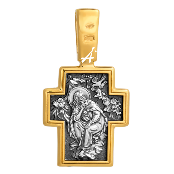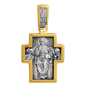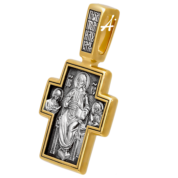 Простой лаконичный крест с изображением Господа Вседержителя и предстоящими Ему Пресвятой Богородицей и Иоанном Предтечей на лицевой стороне и иконой святого Илии Пророка в пустыне на обороте выполнен в традициях русских иконографических крестов. Композиция предстояния на лицевой стороне называется «деисус». В церковном иконостасе деисусный чин, продолженный образами архангелов, святителей, мучеников и преподобных, является главным. Он показывает совершенную Церковь святых, молящихся Богу за людей на земле. Над образом Деисуса на ухе написаны слова молитвы: «Господи, помилуй мя».