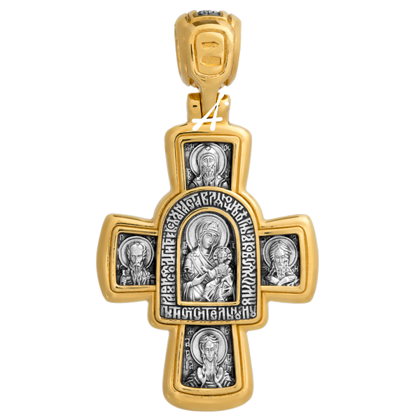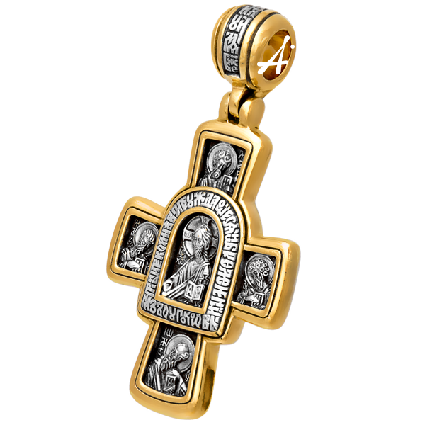 В глубокой древности поклонные кресты украшали киотами с почитаемыми иконами Христа и Богородицы со словами молитв и образами святых. Позже обычай помещать иконы святых на крест перешел и на нательные кресты. Эта традиция и легла в основу художественного образа данного креста.