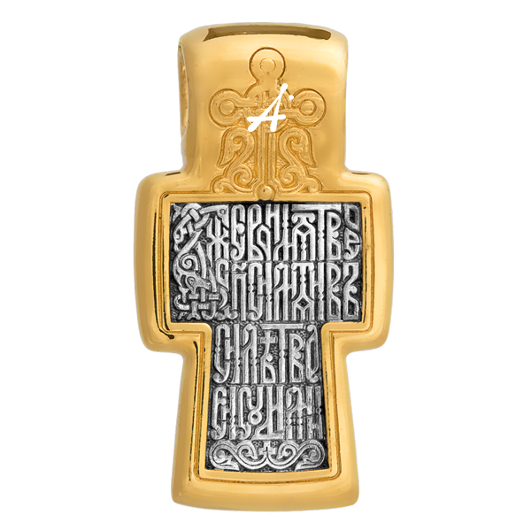 На обороте креста помещена древняя молитва, отражающая глубинный смысл образа Христа Вседержителя на лицевой стороне: «Боже, во имя Твое спаси мя, и в силе Твоей суди мя». Эта молитва выражает упование на милосердие Бога, Который так возлюбил мир, что отдал Сына Своего Единородного на крестные страдания для спасения грешных людей, и Который волен миловать или казнить их на Страшном Суде. Сила Божья — это Сам Господь Иисус Христос, воплощение Божественной Любви и Истины. Произнося слова молитвы, мы просим Бога, чтобы Он избавил нас от вечных мук не за наши достоинства, а во Христе и по бесконечной любви Своей сделал нас сонаследниками Вечной Жизни.