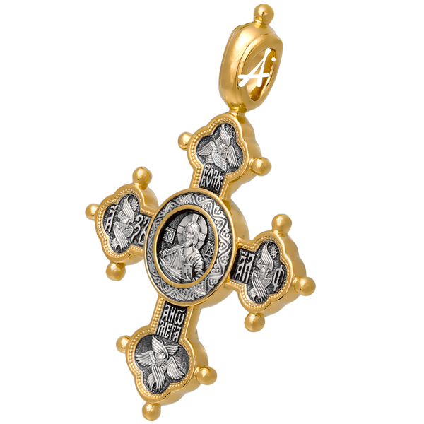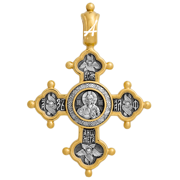 На лицевой стороне Иисус Христос является как Господь Вседержитель, Творец мира и его Грозный Судия, царящий на Небесах. Небо символически представлено золотым кругом, от которого лучами расходятся перекладины креста. На трехчастных, во образ Пресвятой Троицы, концах перекладин изображены высшие ангелы, первыми стоящие у Престола Господа, — серафимы (с шестью крыльями) и херувимы (с четырьмя крыльями). Вокруг написаны слова Апокалипсиса: «Азъ есмъ альфа и омега». Это откровение Бога о том, что в Нем начало и конец всего сущего.