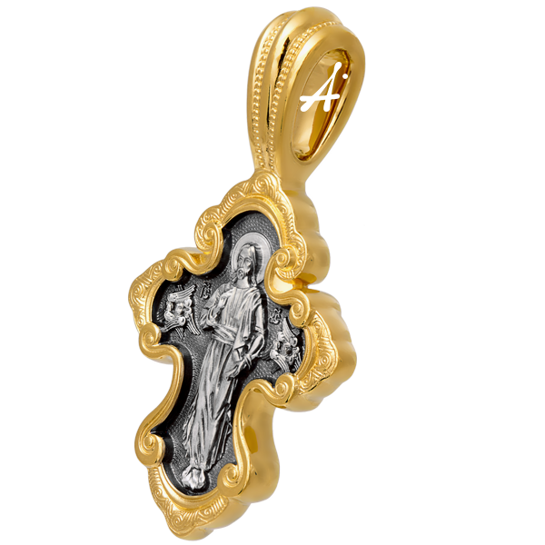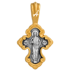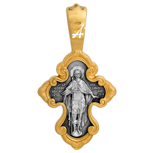 Традиционная форма этого креста близка по своему художественному решению серебряной раке, в которой покоятся мощи св. блгв. кн. Александра Невского в Свято-Троицком соборе Александро-Невской лавры. Завитки волют обрамляют величественные фигуры Христа Вседержителя на лицевой стороне и святого Александра Невского на обороте.