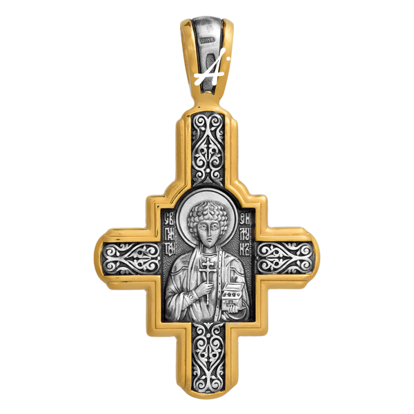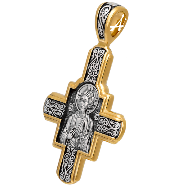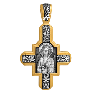 Нательный крест с образами Господа Вседержителя на лицевой стороне и великомученика Пантелеимона Целителя на обороте традиционен по иконографии и своему художественному решению. Изображение Господа с книгой в руке и благословляющей десницей - одно из самых древних. На этой иконе Иисус Христос является как вершитель судеб человеческих, владыка и судья всего мирозданья. Книга в Его руке символизирует Книгу Бытия. В ней записаны все дела человеческие и имена тех, кого Господь избрал для вечной жизни. Не все войдут с праведниками в Царствие Небесное. «Не обманывайтесь, - говорит апостол Павел (1Кор., 6,10), - ни блудники, ни идолослужители, ни прелюбодеи, ни малакии, ни мужеложники, ни воры, ни лихоимцы, ни пьяницы, ни злоречивые, ни хищники Царства Божия не наследуют».