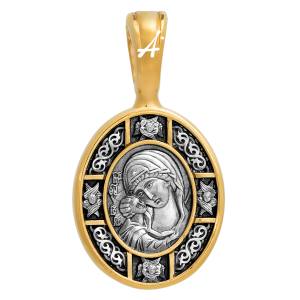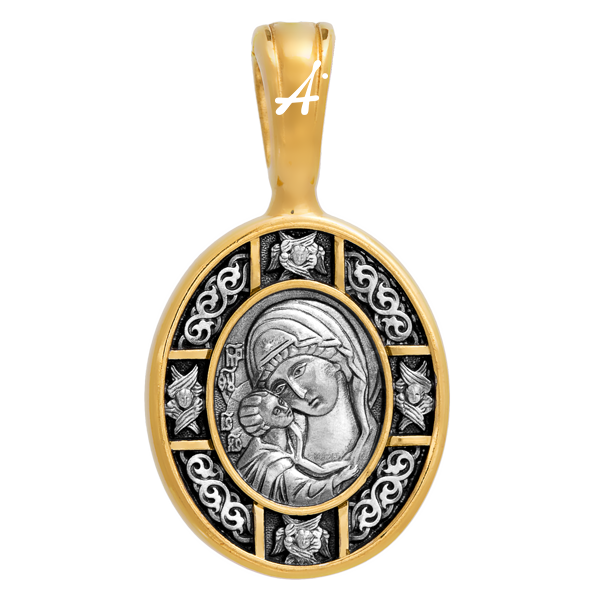 На одной из сторон двустороннего образка, выполненного в форме овального медальона, изображена икона Пресвятой Богородицы Игоревская. Это чудотворная икона, почитаемая в Православной Церкви как скорая помощница в различных бедственных случаях, утешительница в скорбях.