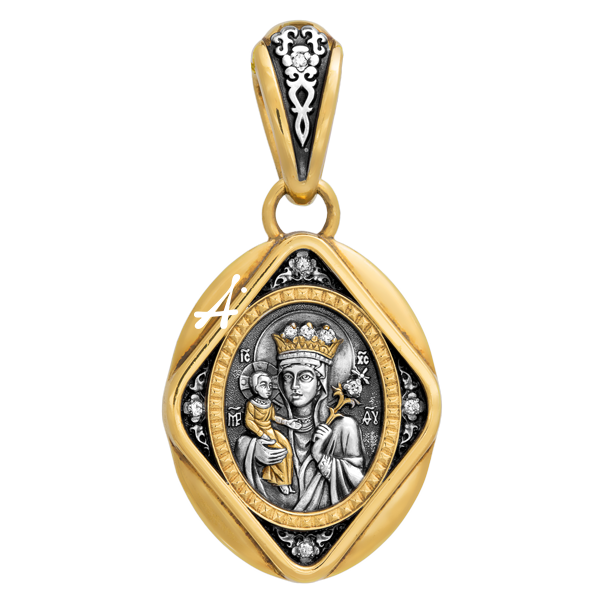 Пресвятая Богородица, одетая в царские одежды, венчаемая высоким царским венцом, украшенным драгоценными камнями, в правой руке держит Богомладенца, а в левой – драгоценный цветок на длинном стебле. Оба изображения, данные в зеркальной симметрии, композиционно как бы продолжают друг друга, раскрывая глубокий символический смысл всего образа.