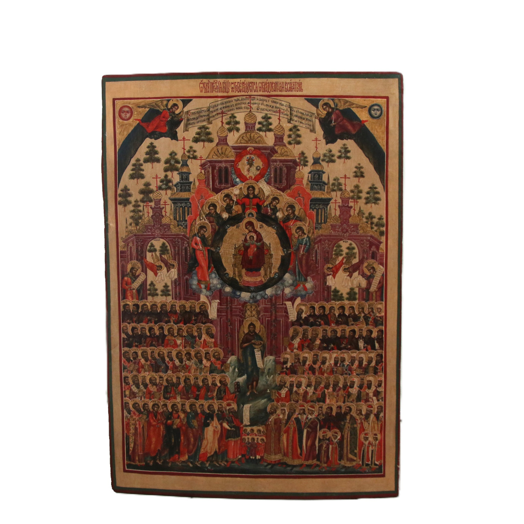 - Центральный образ Богоматери с Младенцем окружает ликующий собор ангелов и святых