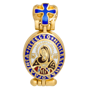 Небольшой овальный энколпион в виде медальона с образом Пресвятой Богородицы «Умиление» на лицевой стороне выполнен в традиционной византийской технике выемчатой эмали. Внутри энколпиона написаны первые две строчки архангельского приветствия: «Богородице, Дево, радуйся, благодатная Марие, Господь с Тобою».