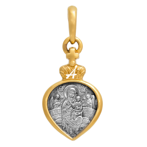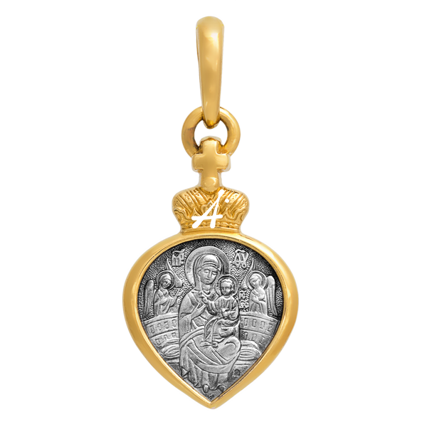 Увенчанный царственной короной миниатюрный образок посвящен одному из самых величественных и почитаемых образов Божией Матери — иконе «Всецарица». На этой иконе Богоматерь изображена восседающей на царском троне. В руках Она держит Богомладенца со свитком в левой руке. Пальцы правой руки Иисуса Христа сложены в благословляющем жесте. Богородица указывает на Своего Царственного Сына как на Спасителя. С двух сторон от трона предстоят ангелы, которые с благоговением поклоняются Пречистой Деве.