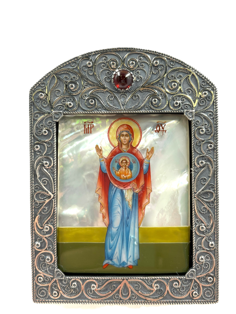 Оклад иконы выполнен из серебра 925 пробы с вставкой из граната. Лик святого написан на перламутровой вставке.