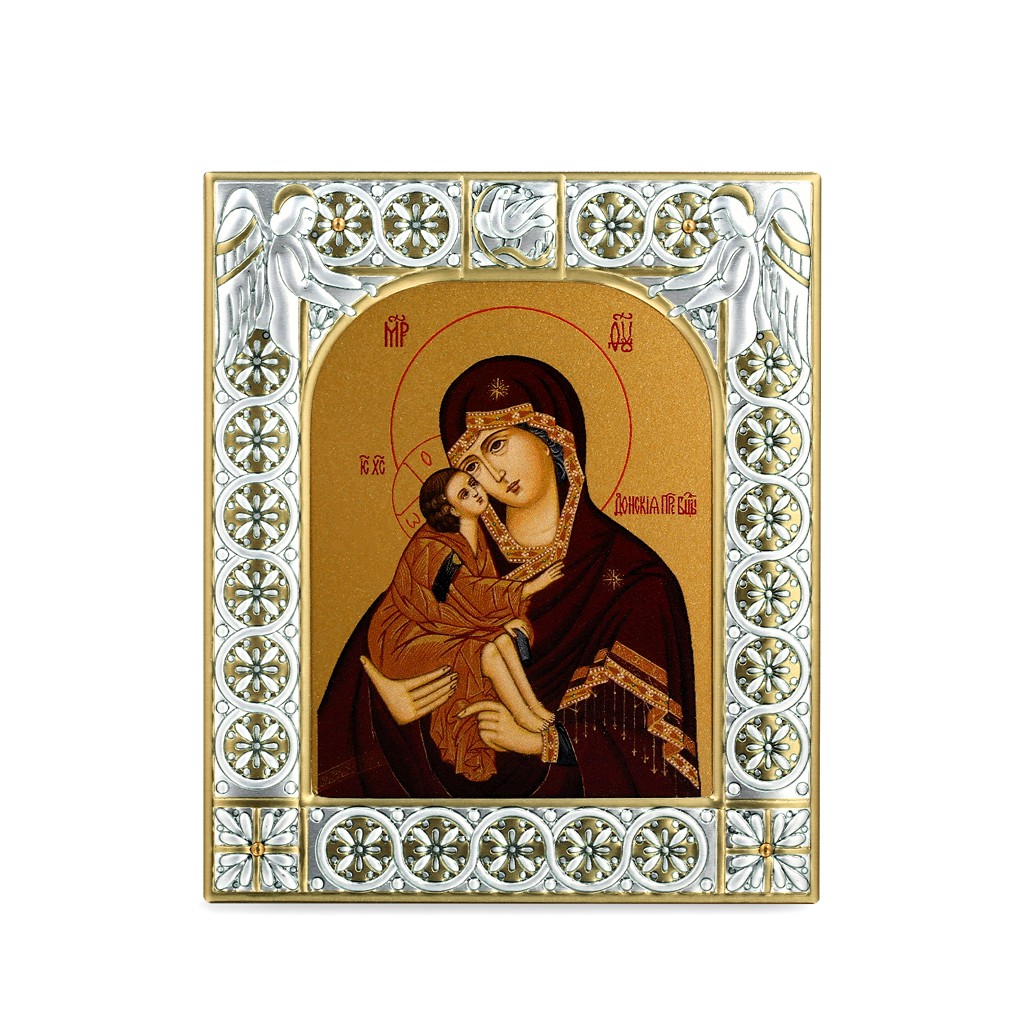 Размер иконы 88*104 мм. Рамка выполнена из сублимационного алюминия, покрытого посеребрёнными красками