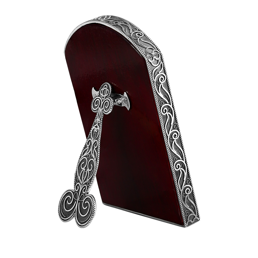Оклад иконы выполнен из серебра 925 пробы с вставками из граната и 32 бриллиантов. Лик святого написан на перламутровой вставке.