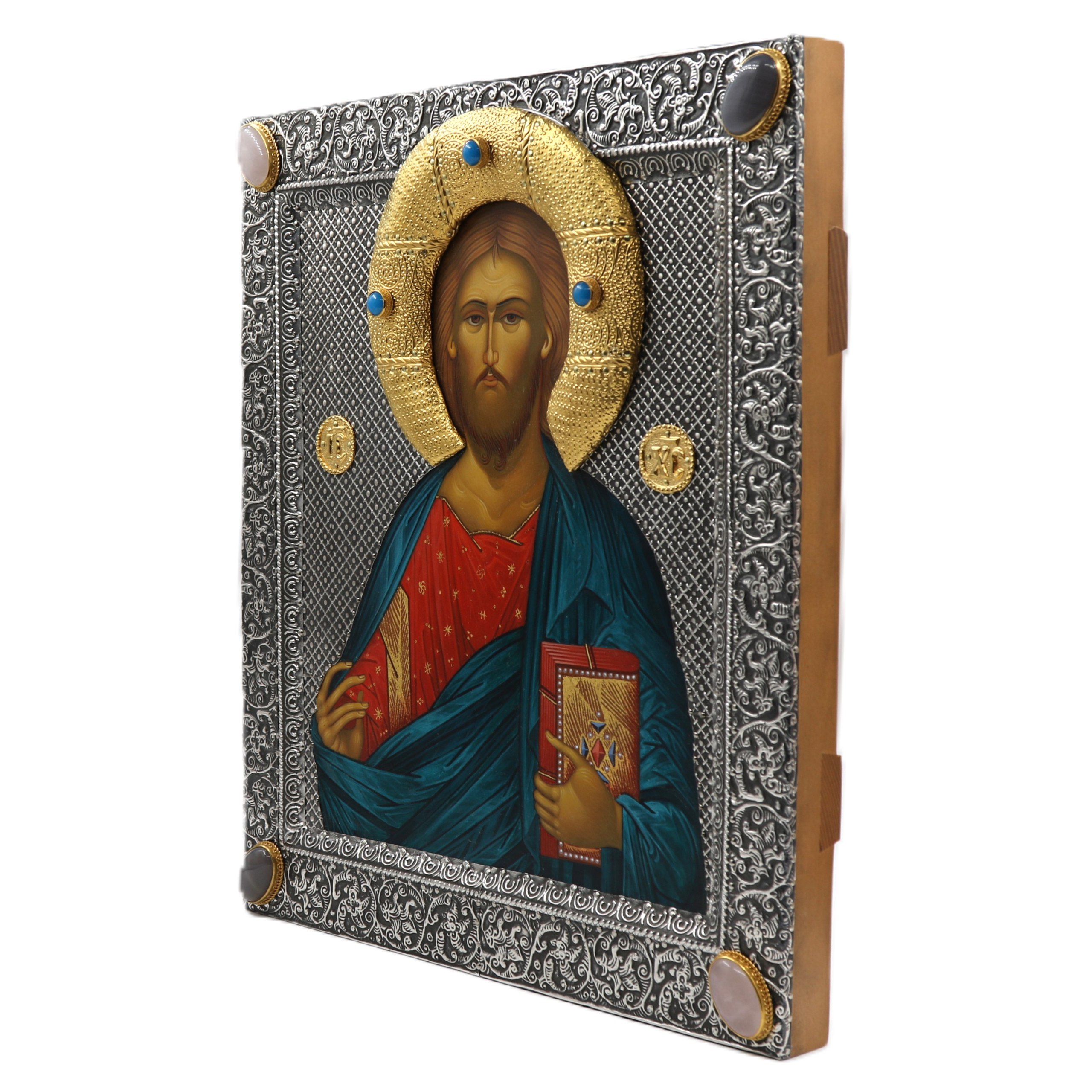 На основном фоне, по сторонам от образа Вседержителя, расположены два чеканных круглых медальона с торжественными славянскими надписями: «IC» и «XC». Эти христограммы — знак священного имени Иисус Христос, неразрывно связанный с иконным ликом и утверждающий истину Богоявления.
