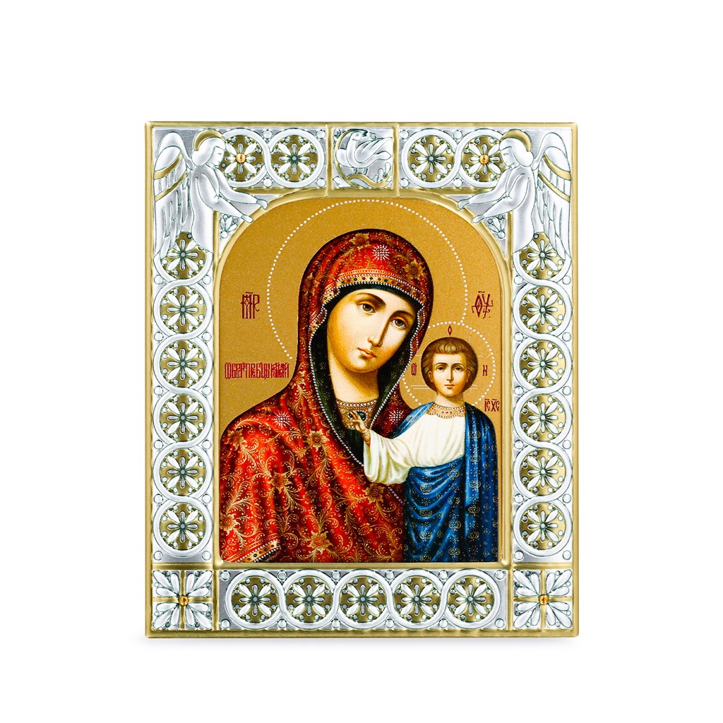 Размер иконы 88*104 мм. Рамка выполнена из сублимационного алюминия, покрытого посеребрёнными красками