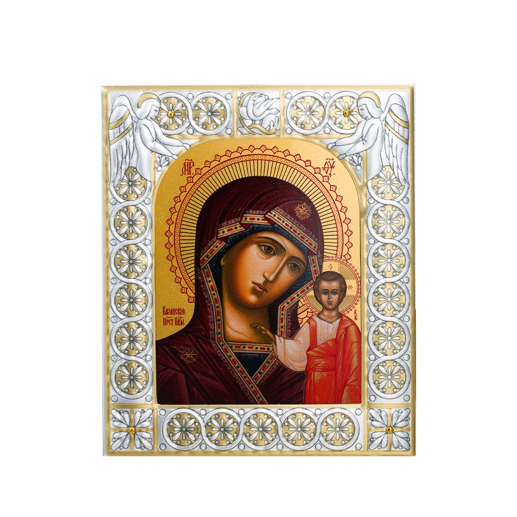 Размер иконы 88*104 мм. Рамка выполнена из сублимационного алюминия, покрытого посеребрёнными красками