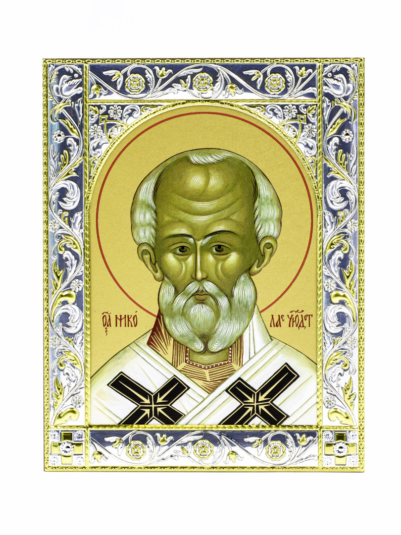 Размер иконы 140*180 мм. Рамка выполнена из сублимационного алюминия, покрытого посеребрёнными красками